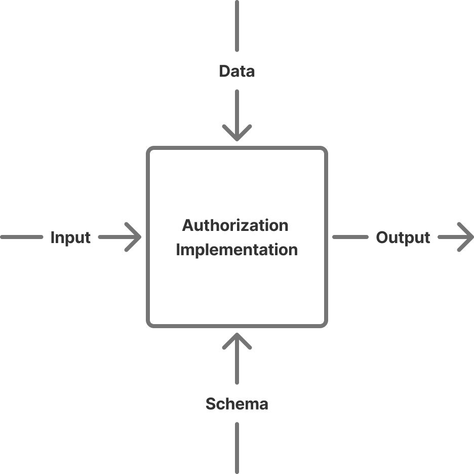 This input and output is informed by an implementation’s schema and data. The schema is dependent on your authorization model. In RBAC the schema is the roles you define; in ABAC it is the attributes you want to match on; in ReBAC it is the relationships between different entities; ACLs are effectively schemaless. The data is the actual triples that you’re storing. Typically you would create this data when other events happen in your application. For example if a new user is created in your application in addition to creating that user in the application database you would create all the necessary triples to represent that users scope of authorization.